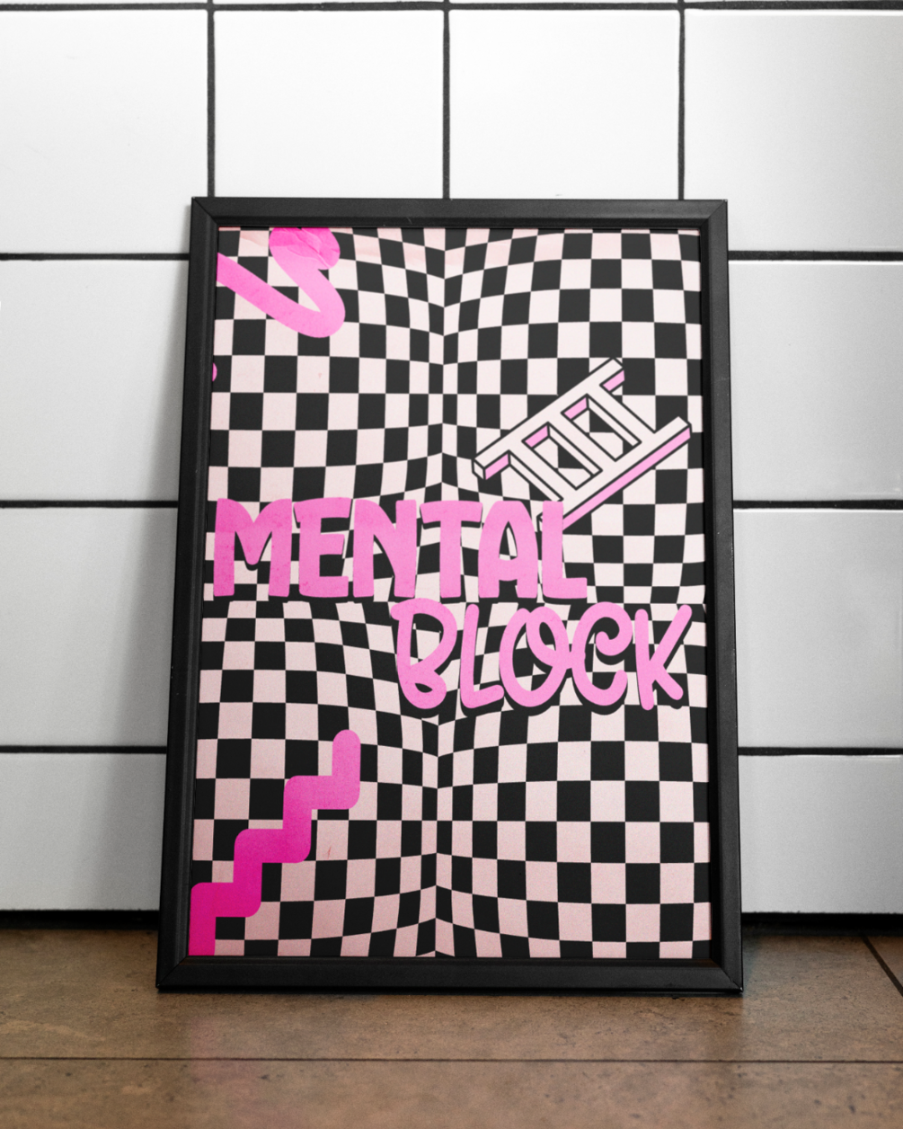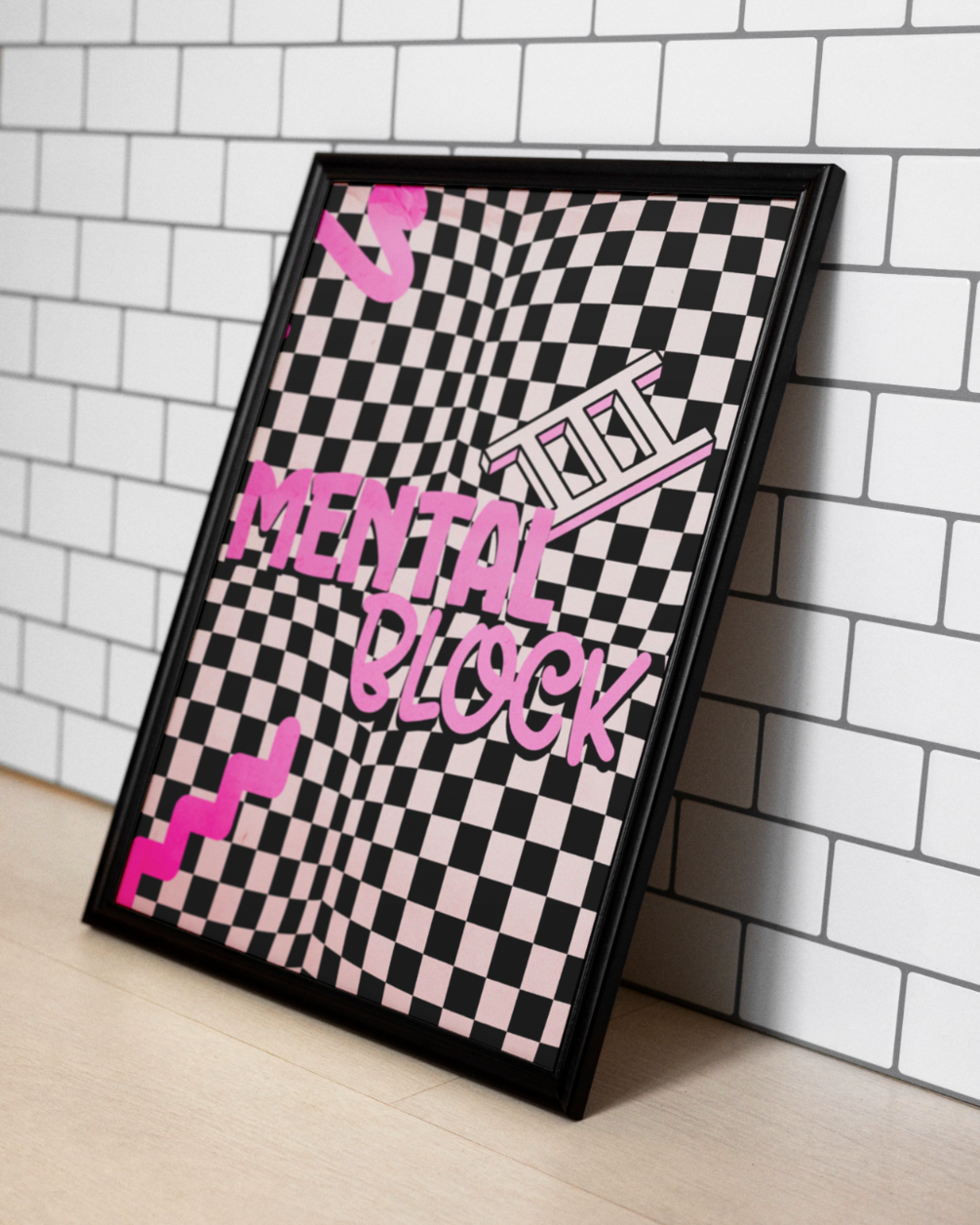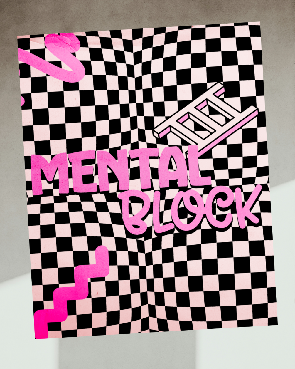 Unleash your creative energy with our "Mental Block" poster design! This captivating piece features a dynamic black and white checkerboard pattern providing a disorienting yet intriguing backdrop for the bold "MENTAL BLOCK" typography in vibrant pink. Accented with abstract pink graphic elements like a ladder and wavy lines, this design is a must-have for anyone looking to add a unique, thought-provoking aesthetic to their collection.