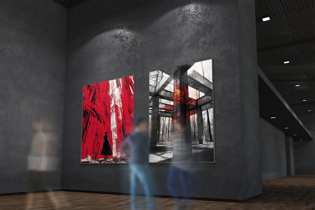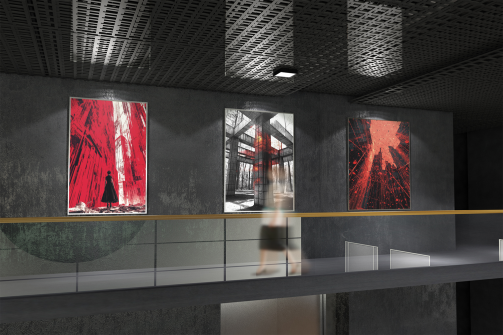 Built with minimalist forms, concrete textures, and sharp monochrome contrasts, this set explores themes of digital rebellion, fractured systems, and controlled chaos — all anchored in grayscale with red as the single, defiant accent.