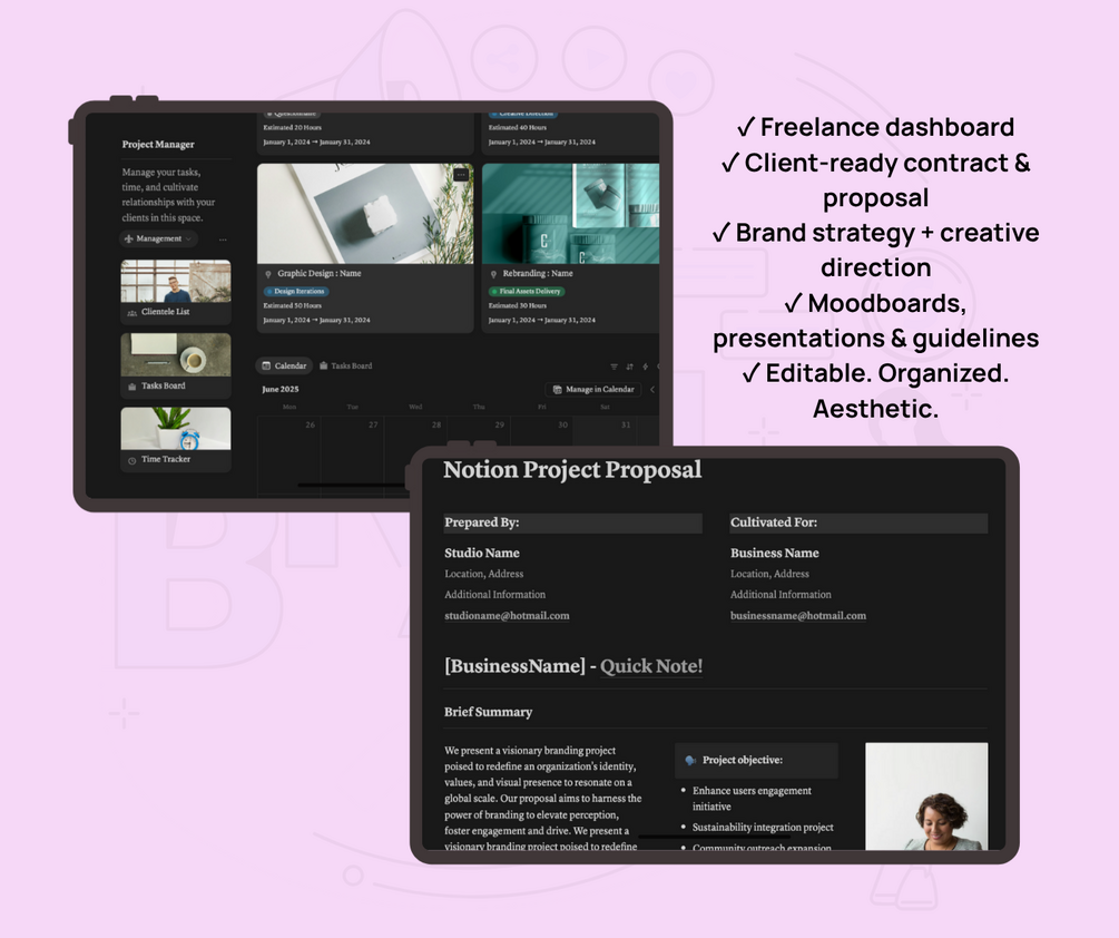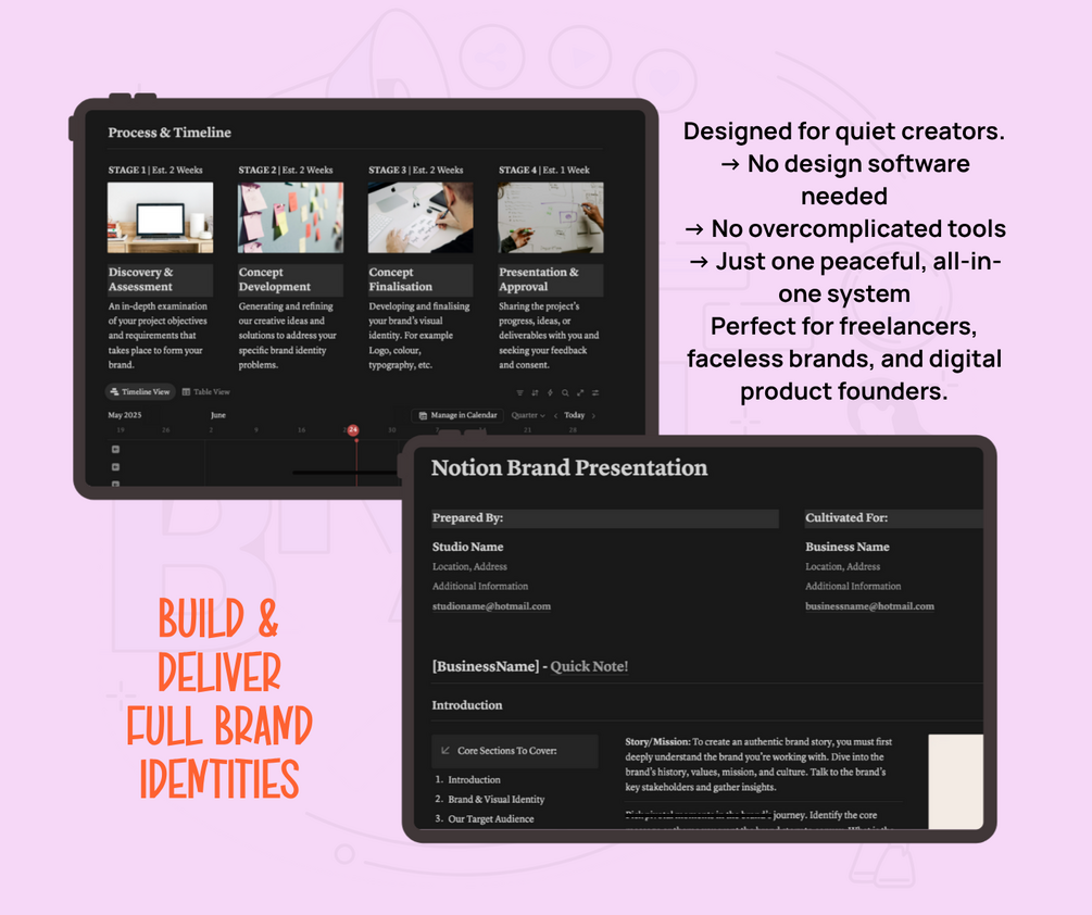 You will get an entire branding studio in one sleek Notion dashboard — ready to duplicate, customize, and impress.